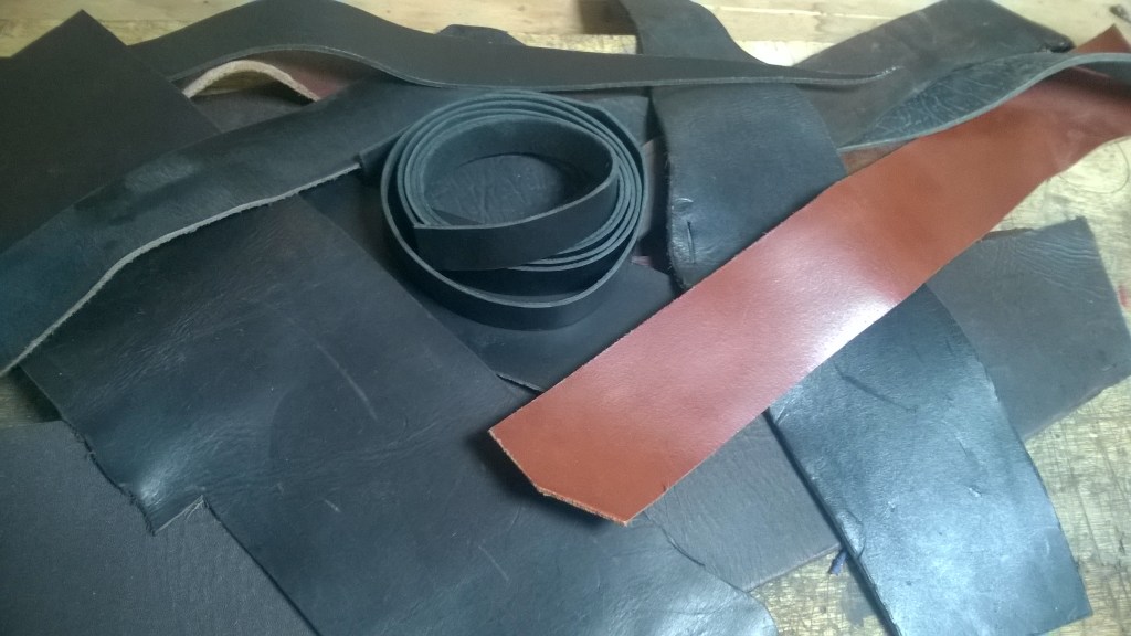 Belt blanks (centre of image) can be bought online from auction sites. A 22mm x 5ft belt blank will give 3 strap blanks with some left over for a strap keeper (loop) or two. 22mm is a common watch strap size. Alternatively pay a little more for a 50mm (2″) belt and cut 6 blanks of mixed 22, 24, 26mm widths or whatever other size you need. Again thickness is relevant and all options are open if you are happy to thin straps down. A 22mm belt blank has cost me on average £7.50/$10 so far: for some very nice quality leather at less than £3 a strap blank.