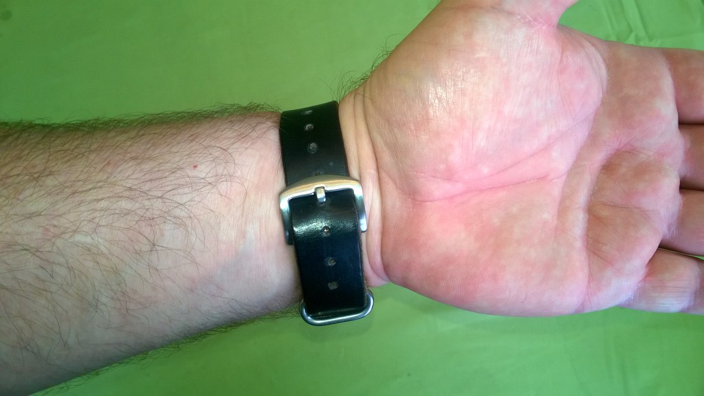 The average mans wrist is around 18cm – mine is closer to 21cm. The standard buckle sits on the side of my wrist not the underside. Not comfortable.