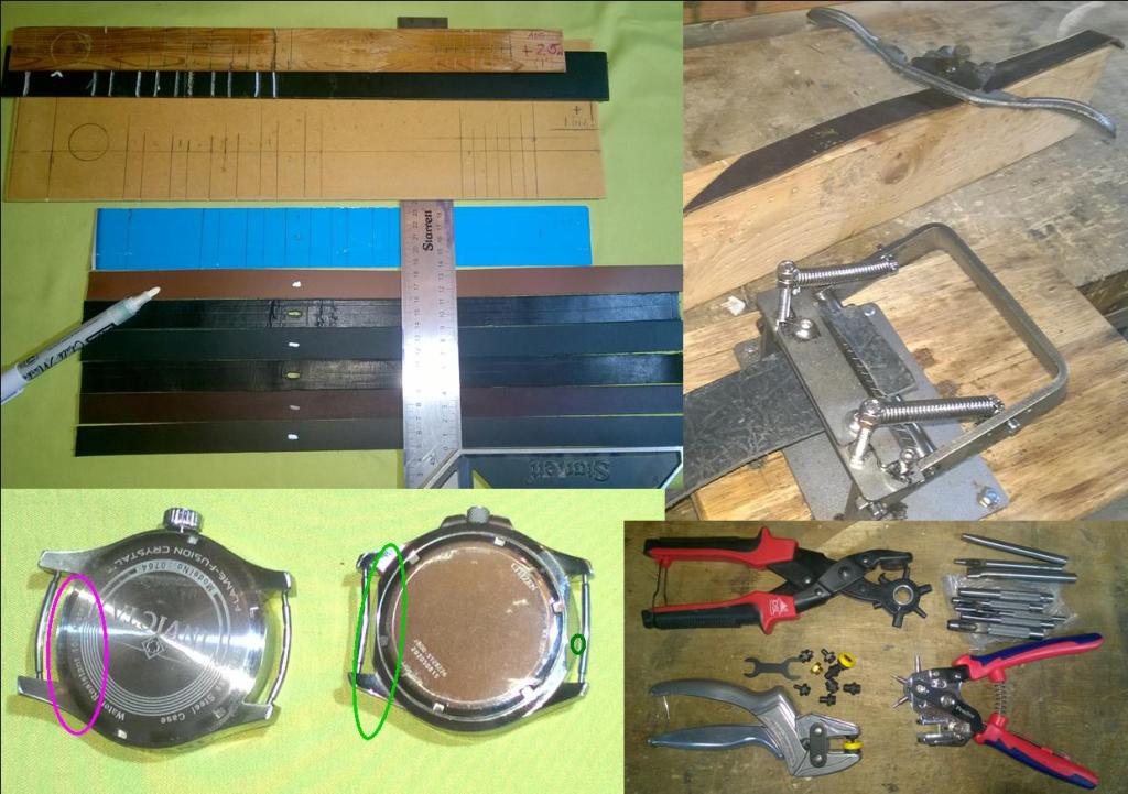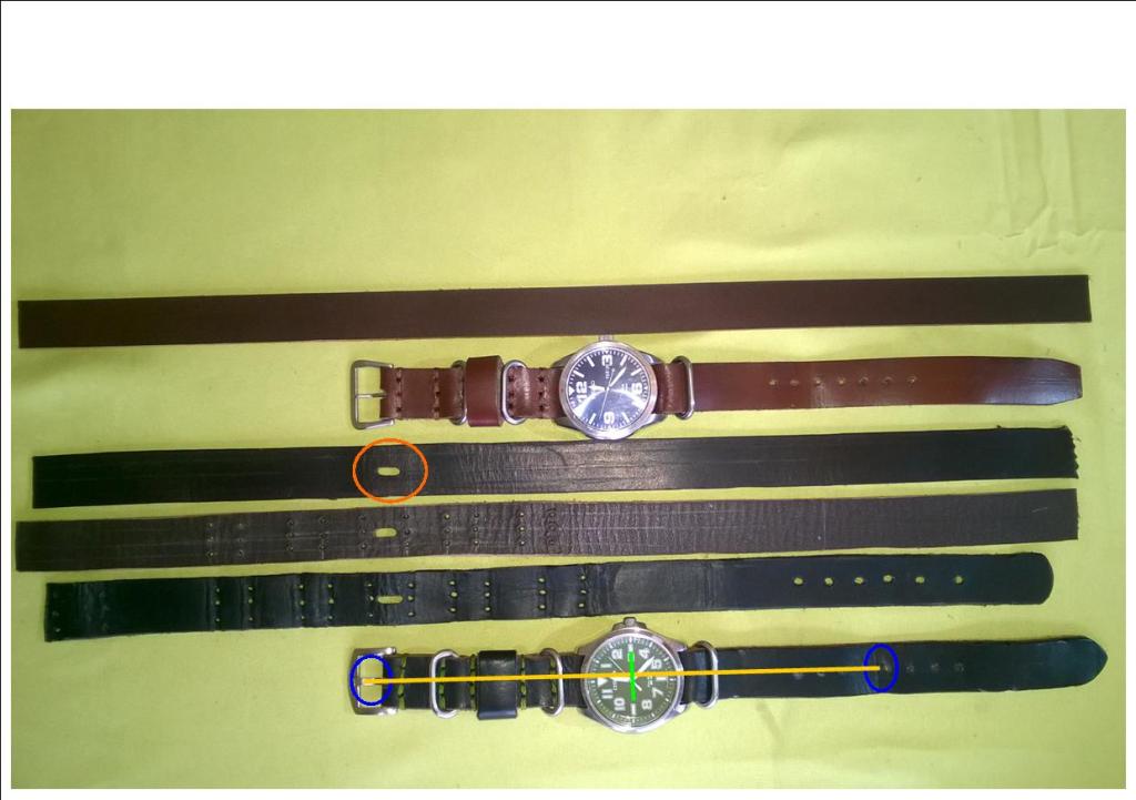 Below bottom left shows what I’m talking about. The Invicta watch on the left has a completely round case and the bars/pins are bent to create strap space. On the right the Eco Drive has flattened areas (green circle) to enable a thicker strap to pass through and sit flatter. Note less bend applied to the pins. This unsuprisingly is common on military/field watches. Curved bars/pins are available online, or do it yourself – see pg4. Secondly, the strap needs to be thick enough to look the part: be strong enough to rely on and not to fail after a few months. Some of the commercial leather items are only just over 1 millimeter thick – almost like failure is being built in. God forbid! Between 2.0 – 2.7 millimeters will be fine, but not less. The straps will eventually break, normally just above the first prong hole. The measurements I’m giving are the best compromise. I’ve made thicker straps – bars like bananas are needed and they do pop out too easily – however the straps also look too bulky, are uncomfortable and don’t sit right. Avoid.