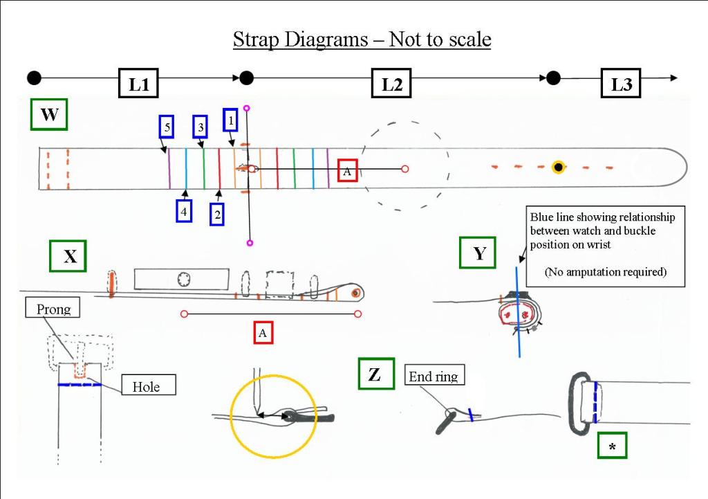 Above you can see all you need to work out your strap length. ‘A‘ is the primary factor, marked as a red square . This is half of your wrist measurement. Fig W shows A as being from buckle to centre of the watch. To complete the circumnavigation of your wrist we can double it to the centre hole as denoted by the yellow ring. This I’ve called ‘L2‘, as per the diag. To the left of the buckle line (denoted by pink ‘barbell’) is ‘L1‘. This is A plus 5cm which accomodates the end ring and gives a small margin to allow the strap to bend. The remainder is ‘L3‘ which is the flappy strap part. This is 90% of A.