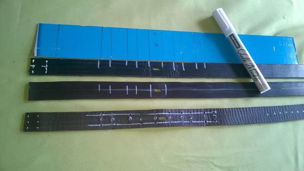 My effort above looks a bit rough but on dark straps I mark the areas with the paint marker and then more accurately with a pencil over the white background in order to see better, not mandatory, just easier. The middle strap has a central white line for the same reason, you wouldn’t be able to see the markings here either! Where the two intersect make a hole – it doesn’t have to be all the way though. You can do that once it’s marked up satisfactorily. The bottom strap shows where I’ve done this leaving the white for demo purposes. Now mark. halfway between the centre holes and the edge. two sets of marks for the remaining stitch holes, as per the image above.