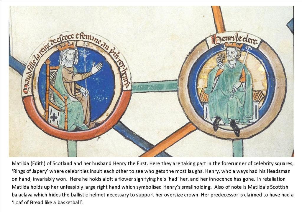 William the Conqueror married Matilda of Flanders c.1050 and set about producing an heir or ten, just in case most didn’t survive, which was the norm. Everything was going as planned by 1066 and, while William toured his new possesions indisciminately killing, pillaging and extorting cash from anyone who had any (who said the poor people got the shitty end of the stick?), Matilda buckled down to the task of fortifying the whole undertaking with some more offspring. One of the early French issue had been a Matilda – That’s not a surprise… is it? Not much is known about her, with many assuming she died in infancy. In fact she was taken into the care of the ‘Trauma’ and was packed off to a Nunnery for initial training. (William vetoed the Sisters of Salope Chaud as it was ‘too far away’ even though he’d nipped across many times to ‘just to help hang an awkard heavy cupboard and put some pictures up’ – most of which had taken over a week.) She was being groomed – not by a middle aged man pretending to be in a boy band – but by the ‘Trauma’, to one day become the ‘Grand Maud’ of the whole organisation.