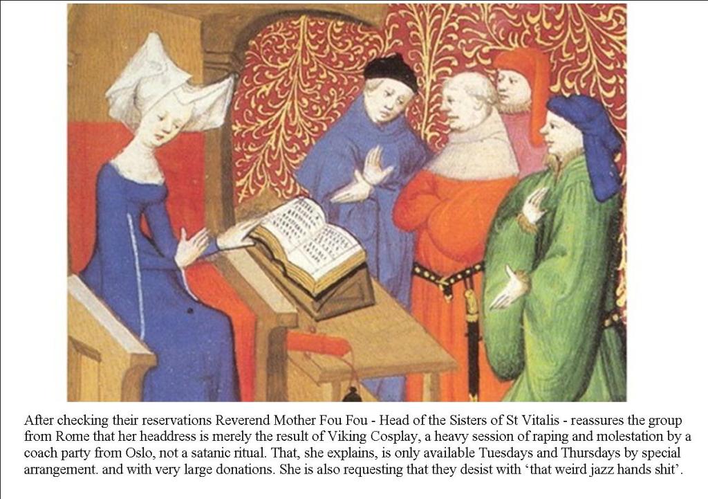 Once assembled the ‘Trauma’ (an archaic collective noun for a group of obdurate women on a mission) made their way to the abode of the Oracle, the Nunnery of Salope Chaud. The Oracle, Doris de Connerie, was sought as she was reputed to commune with the heavens. It took some time to gain an audience, the Oracle herself was not in great demand, but the nuns were popular for the succour they provided. Lines of the needy were lengthy and numerous outside the convent walls. The Nuns themselves – the Sisters of Saint Vitalis – were extremely dedicated to their calling and wore minimalist habits, come rain or shine, to show their piety, which they always kept well tended. Many were fallen women who were rehabilitated through good works. Such a worthy cause attracted considerable funds. Subsequently the ‘Trauma’ was well provided for being waited on by healthy young monks from the neighbouring monastery of St Sebastian in their characteristic leather mini shorts and gilded strapping – another sign of religious dedication (alledgedly). It was a little too early for the Oracle, and the spirits weren’t full within her. The Benedictine ‘chapel’ had only opened an hour earlier. However, she did relate details of the Pope’s recent visit to ‘bless’ the Sisters, who had sore knees to prove it. The Trauma took this as a sign of approval and an endorsement from above . The Incognito Pope – apparently he didn’t want to cause too much religious adulation (yeh -right!) – had also encountered access difficulties. His guard, disorganised and weak, had struggled with ‘pilgrims’ for hours to gain access. This sort of ineptness was only resolved with the advent some years later of a force with clockwork timing and a large Toblerone ration. The Vicar of Rome had stayed a whole month along with a team of enthusiastic Bishops and Cardinals. It was heartwarming to see such fervour in their eyes reported Doris, the Oracle. On his return trip the Pope had dallied for a whole month in Avignon – mostly in traction.