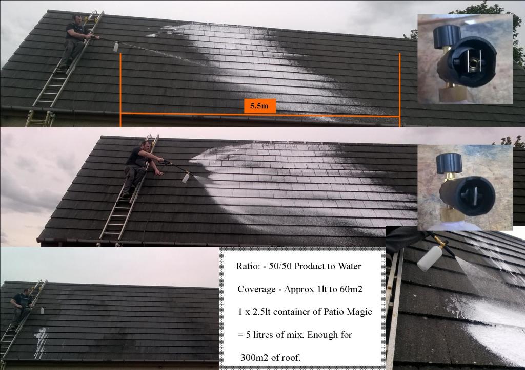 The image above shows the lance with nozzle open. Without moving the lance it’s reaching 5.5 metres. Using your reach and the gun, plus extensions, 8 metres is easily achieveable. The major plus is the product is not being blown about and dispersed due to the power charactersitics of the lance. There was a 10 mph breeze from behind the operator, at about 11 o’clock – direction not time. As this roof is just under 5 metres from ridge to gutter it’s not required to actually get onto the roof . That’s been done for visual purposes. For the same reason the roof is moss free having been treated previously. It was judged the best roof for ‘show’ purposes – by me not some weird competition.