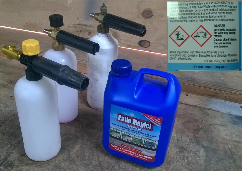 One day a few months back I had a brainwave. Combine the two together. Apply the patio magic with the power washer. I hadn’t seen it done elsewhere but it sounded feasible. I’d been using a snow (foam) lance on the familys’ cars for years. It had good coverage and flew a good distance without excessive force.