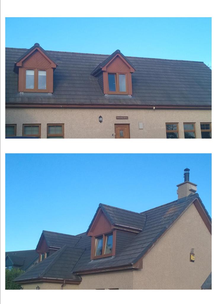 Bottom left shows roof after around 7 minutes. The foam has gone and it’s starting to dry. However, the chemicals are still present and any moss will still be soaking.